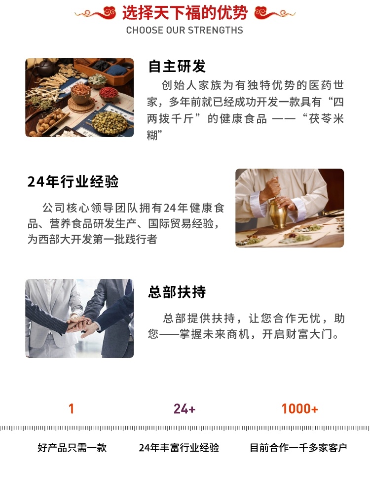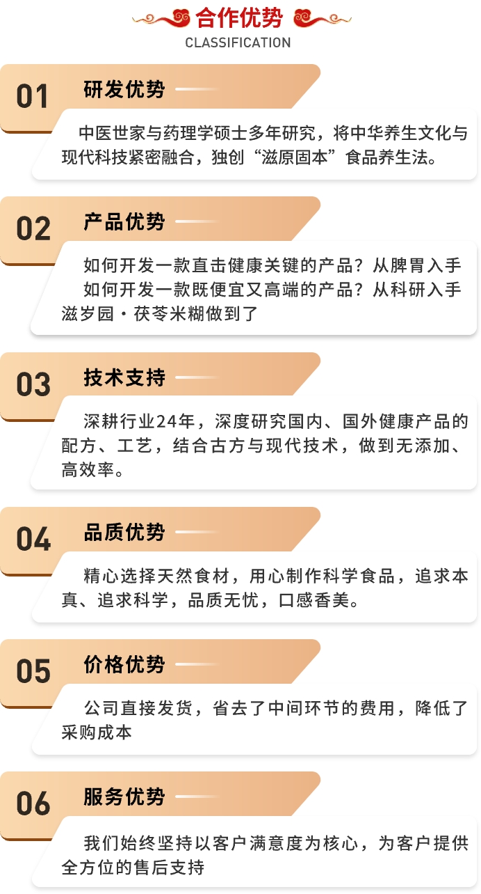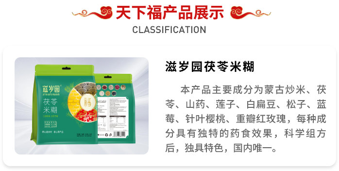 天下福科技研究成果——滋岁园茯苓米糊,是医药家族在临床实践中不断积累的经验结晶,深度研究了“九仙王道糕”“三仙糕”“长寿粉”“八珍粉”“四神汤”“五行健脾散”的组方,并融合了现代研究成果。挖掘药食同源,深究科学配方,追求道地品质,满足现代生活。